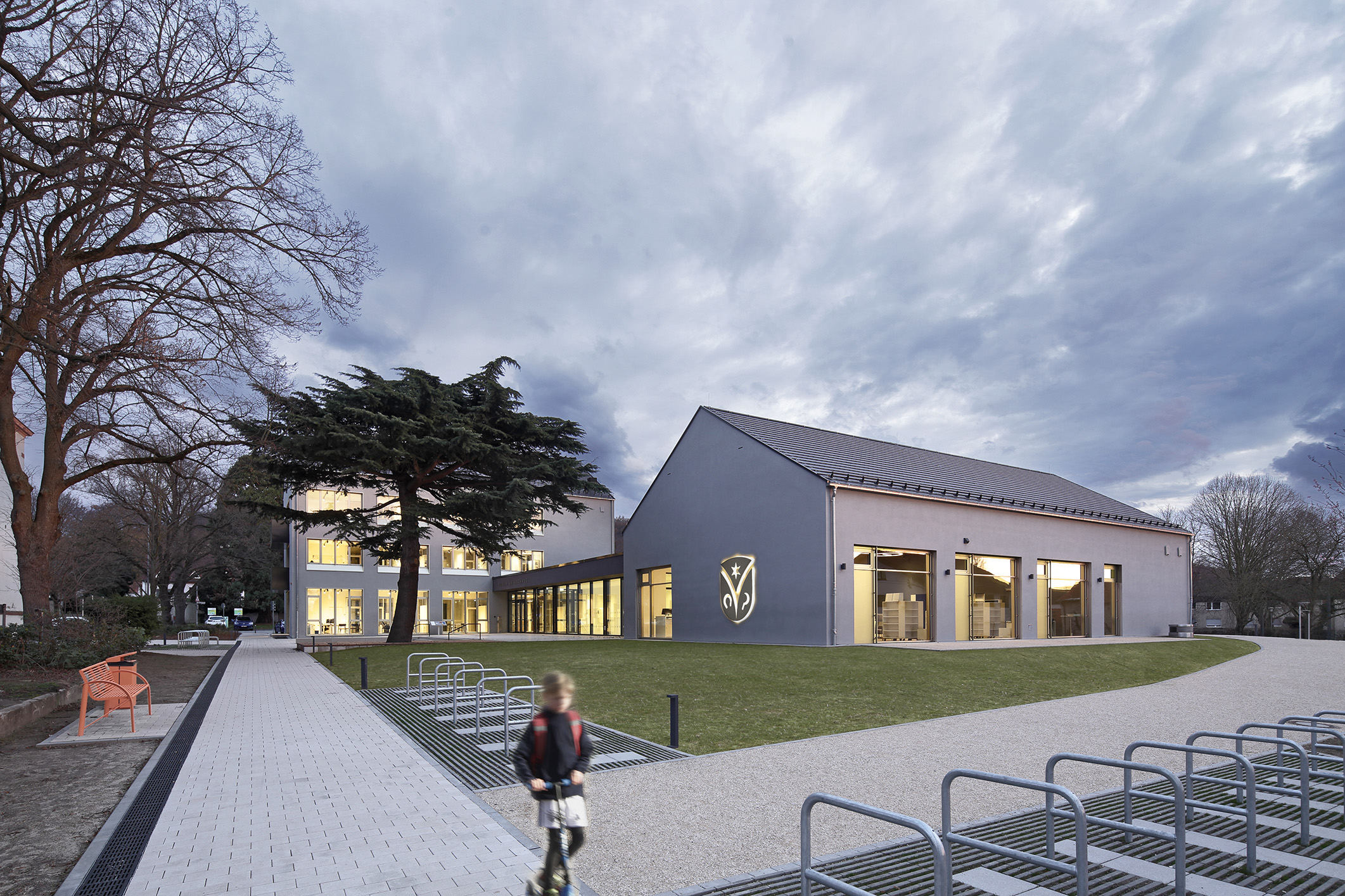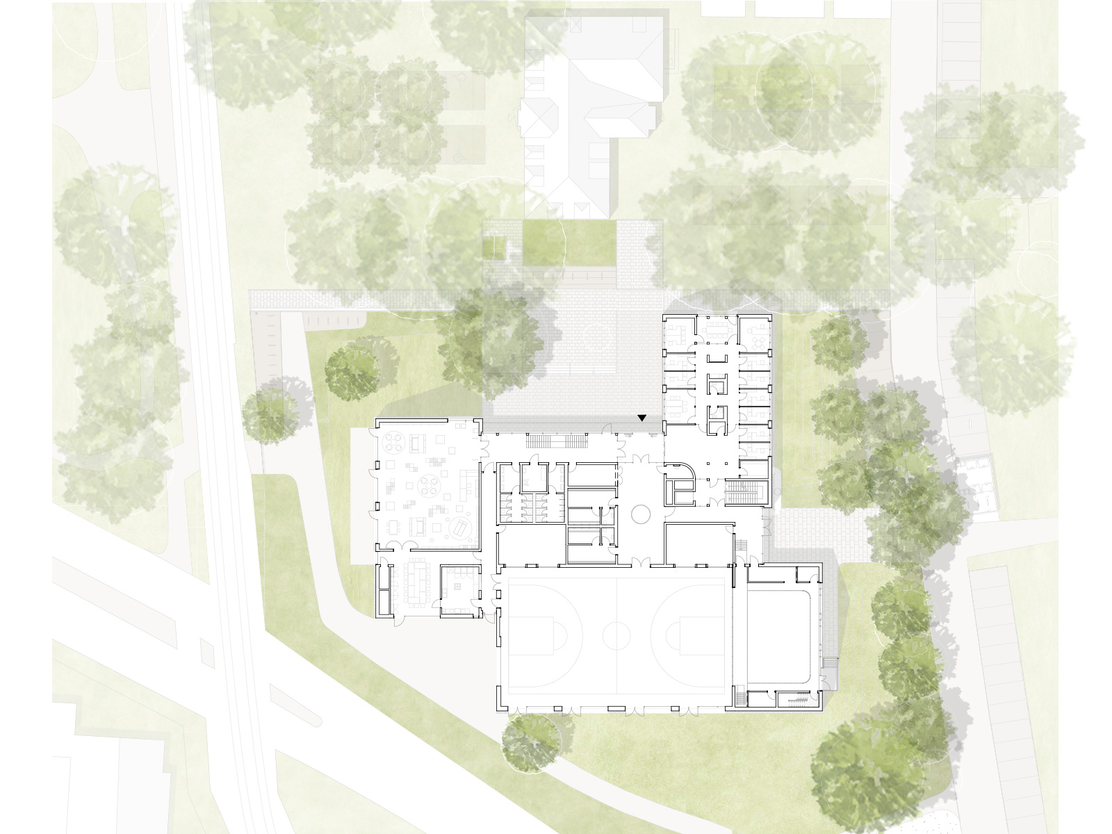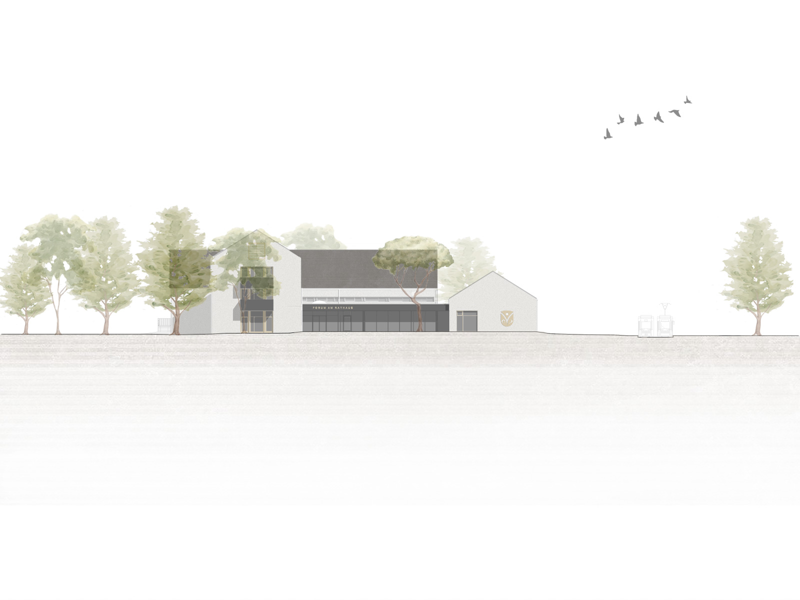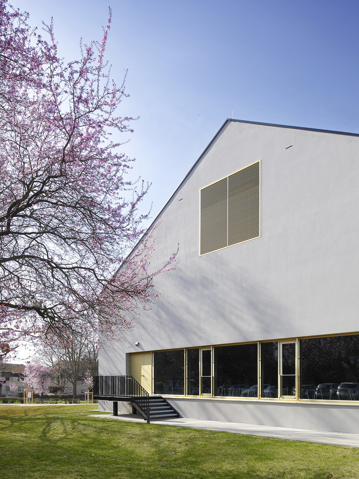Seeheim-Jugenheim, eine im Jahr 1977 durch die hessische Gebietsreform geformte Kommune, beheimatet heute rund 16.000 Einwohner in sieben Ortsteilen. Das pulsierende Zentrum bildet der Ortsteil Seeheim, der mit etwa 9.000 Bewohnern nicht nur der bevölkerungsreichste Teil ist, sondern durch seine Lage an der Bergstraße auch von einem besonders milden Klima profitiert. Diese klimatische Besonderheit prägt die Landschaft nachhaltig und macht sie zu einem fruchtbaren Kulturraum für Wein-, Obst- und Edelkastanienanbau. Der gesellschaftliche Mittelpunkt konzentriert sich auf den Villenave-d´Ornon-Platz rund um die alte Schule, die heute als Amtssitz des Bürgermeisters dient. Dieses Areal ist geprägt von einer harmonischen Mischung aus Wohngebäuden, Einzelhandel und weitläufigen Parkanlagen, die den Übergang zwischen gewachsener Dorfstruktur und freier Natur markieren. Den südlichen Abschluss dieses Bereichs bildete lange Zeit die 1970 errichtete Sport- und Kulturhalle, die jedoch im Jahr 2016 aufgrund schwerwiegender baulicher Mängel stillgelegt werden musste. Die ursprüngliche Planung für die Erneuerung sah vor, das Gebäude bis zur Kellerdecke zurückzubauen und auf den bestehenden Fundamenten neu zu errichten, wobei man sich eng an der ursprünglichen Grundfläche orientierte. Nach einer detaillierten Untersuchung des Bestands wurde dieses Vorhaben jedoch revidiert. Da die Sanierung des alten Kellers wirtschaftlich kaum Vorteile gegenüber einem Neubau bot, entschied man sich für einen vollständigen Ersatzbau, der modernen technischen Standards entspricht. Das architektonische Konzept des Neubaus geht weit über eine reine Funktionshalle hinaus und sieht ein vielseitiges Bürgerzentrum vor. Um die unterschiedlichen Anforderungen von Verwaltung, Mediathek, Archiv und Sportstätten unter ein Dach zu bringen, wurde der Entwurf eines „Dorfes“ in Form eines Dreiseithofs gewählt. Mit ihren charakteristischen Satteldächern passen sich die drei Baukörper optisch der lokalen Topografie an und vermitteln durch ihre Kleinteiligkeit ein Gefühl von Beständigkeit und Tradition. Ein zentrales Foyer verknüpft die verschiedenen Gebäudeteile zu einer Einheit, während die Neugestaltung der Außenanlagen dafür sorgt, dass das neue Zentrum von allen Seiten zugänglich ist und sich fließend in die bestehenden Wegeverbindungen des Ortes integriert.