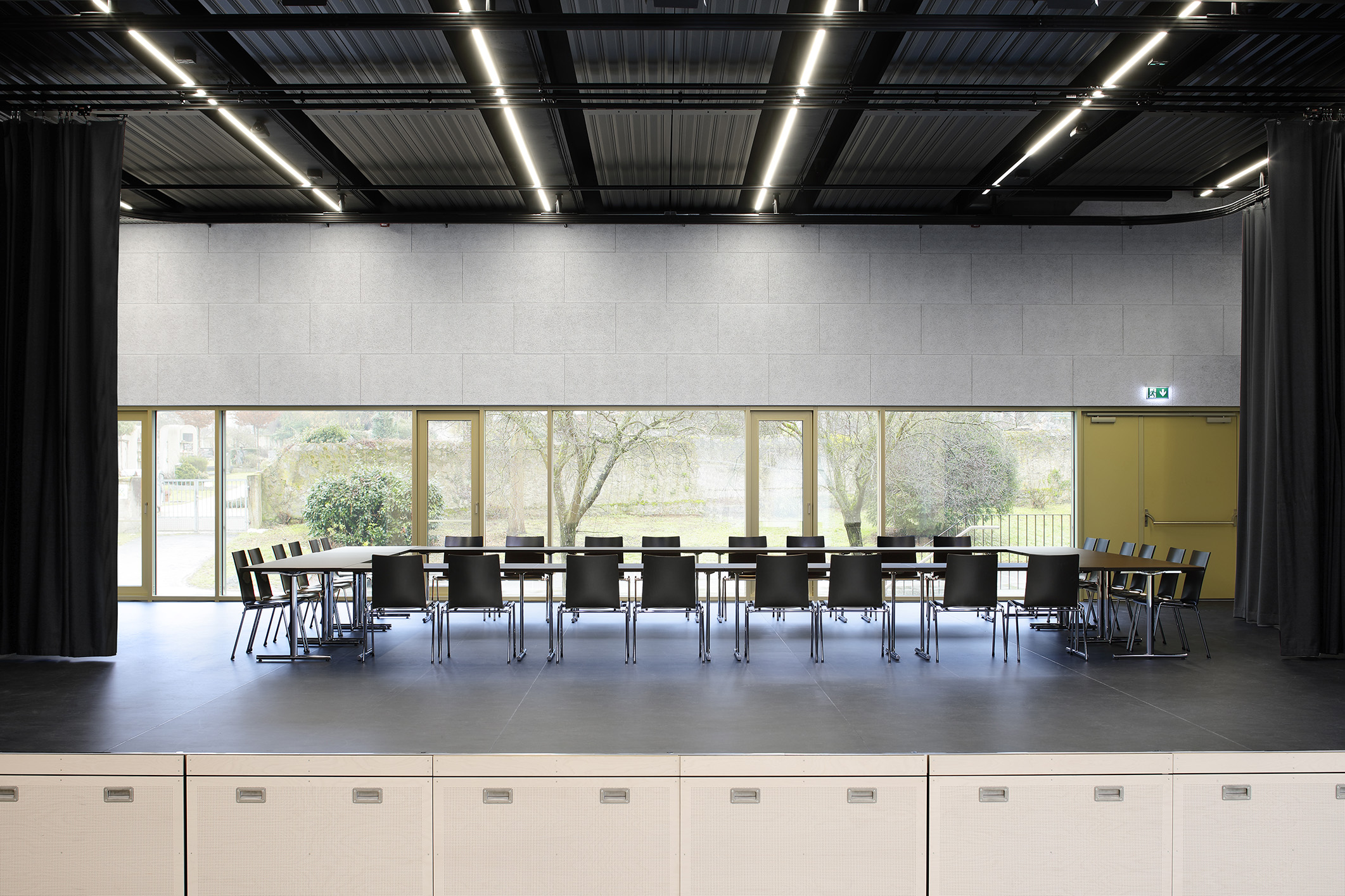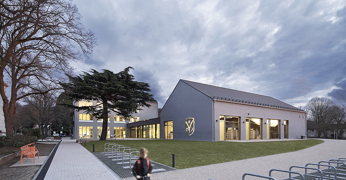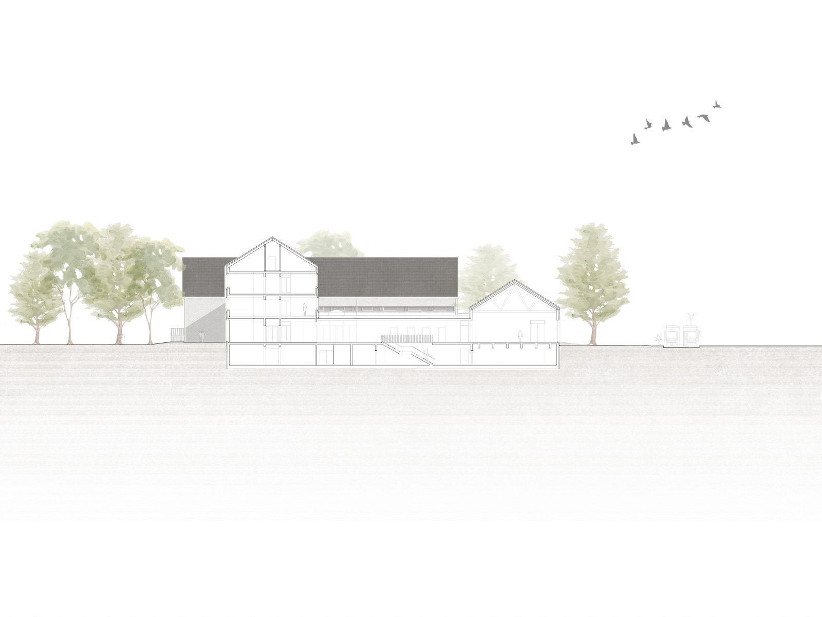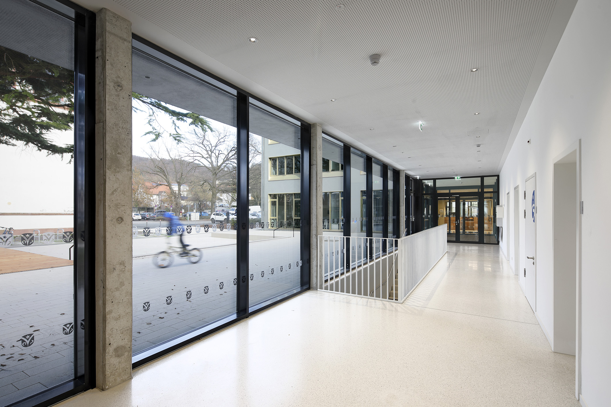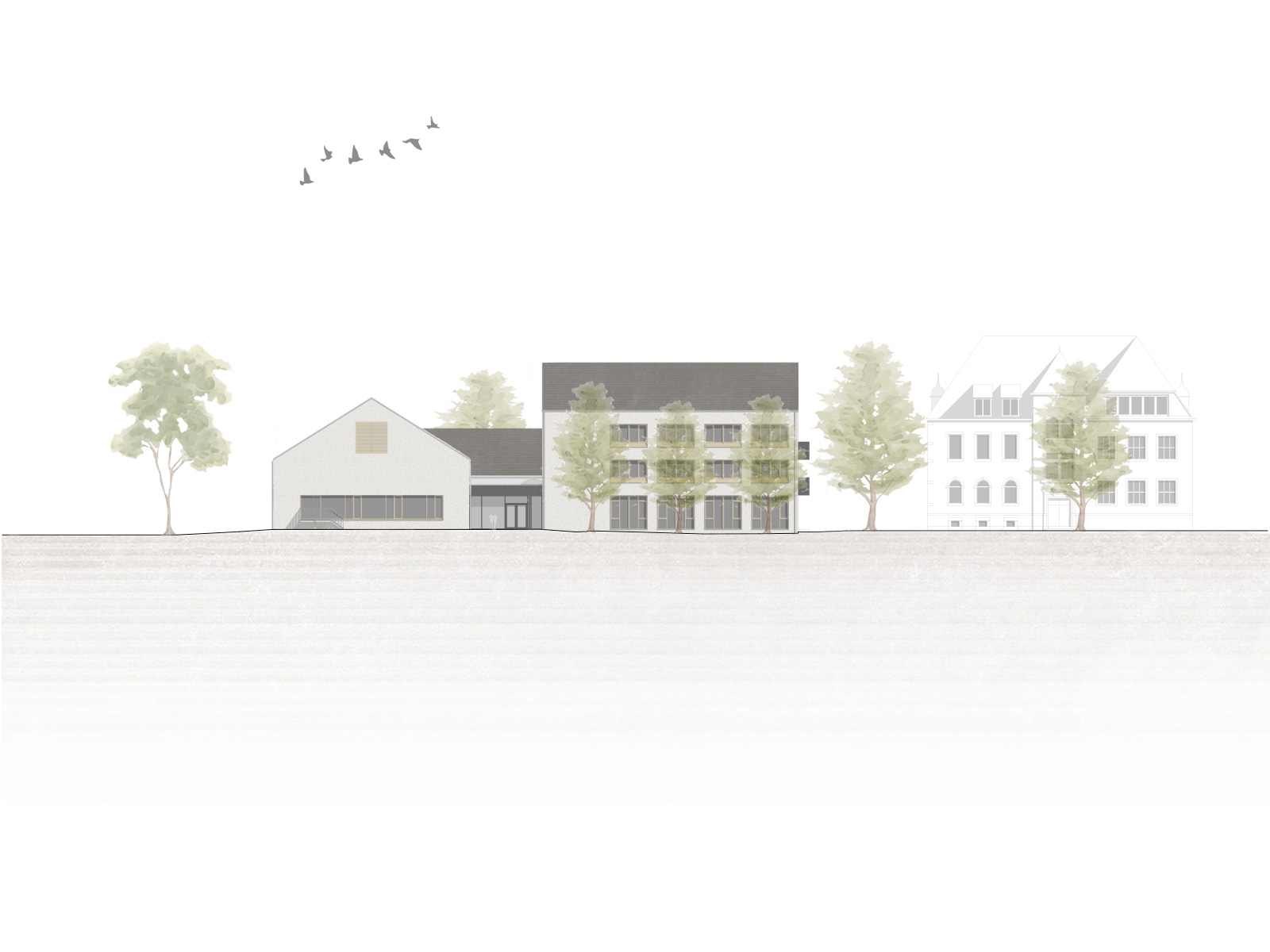 Seeheim-Jugenheim, eine im Jahr 1977 durch die hessische Gebietsreform geformte Kommune, beheimatet heute rund 16.000 Einwohner in sieben Ortsteilen. Das pulsierende Zentrum bildet der Ortsteil Seeheim, der mit etwa 9.000 Bewohnern nicht nur der bevölkerungsreichste Teil ist, sondern durch seine Lage an der Bergstraße auch von einem besonders milden Klima profitiert. Diese klimatische Besonderheit prägt die Landschaft nachhaltig und macht sie zu einem fruchtbaren Kulturraum für Wein-, Obst- und Edelkastanienanbau. Der gesellschaftliche Mittelpunkt konzentriert sich auf den Villenave-d´Ornon-Platz rund um die alte Schule, die heute als Amtssitz des Bürgermeisters dient. Dieses Areal ist geprägt von einer harmonischen Mischung aus Wohngebäuden, Einzelhandel und weitläufigen Parkanlagen, die den Übergang zwischen gewachsener Dorfstruktur und freier Natur markieren. Den südlichen Abschluss dieses Bereichs bildete lange Zeit die 1970 errichtete Sport- und Kulturhalle, die jedoch im Jahr 2016 aufgrund schwerwiegender baulicher Mängel stillgelegt werden musste. Die ursprüngliche Planung für die Erneuerung sah vor, das Gebäude bis zur Kellerdecke zurückzubauen und auf den bestehenden Fundamenten neu zu errichten, wobei man sich eng an der ursprünglichen Grundfläche orientierte. Nach einer detaillierten Untersuchung des Bestands wurde dieses Vorhaben jedoch revidiert. Da die Sanierung des alten Kellers wirtschaftlich kaum Vorteile gegenüber einem Neubau bot, entschied man sich für einen vollständigen Ersatzbau, der modernen technischen Standards entspricht. Das architektonische Konzept des Neubaus geht weit über eine reine Funktionshalle hinaus und sieht ein vielseitiges Bürgerzentrum vor. Um die unterschiedlichen Anforderungen von Verwaltung, Mediathek, Archiv und Sportstätten unter ein Dach zu bringen, wurde der Entwurf eines „Dorfes“ in Form eines Dreiseithofs gewählt. Mit ihren charakteristischen Satteldächern passen sich die drei Baukörper optisch der lokalen Topografie an und vermitteln durch ihre Kleinteiligkeit ein Gefühl von Beständigkeit und Tradition. Ein zentrales Foyer verknüpft die verschiedenen Gebäudeteile zu einer Einheit, während die Neugestaltung der Außenanlagen dafür sorgt, dass das neue Zentrum von allen Seiten zugänglich ist und sich fließend in die bestehenden Wegeverbindungen des Ortes integriert.