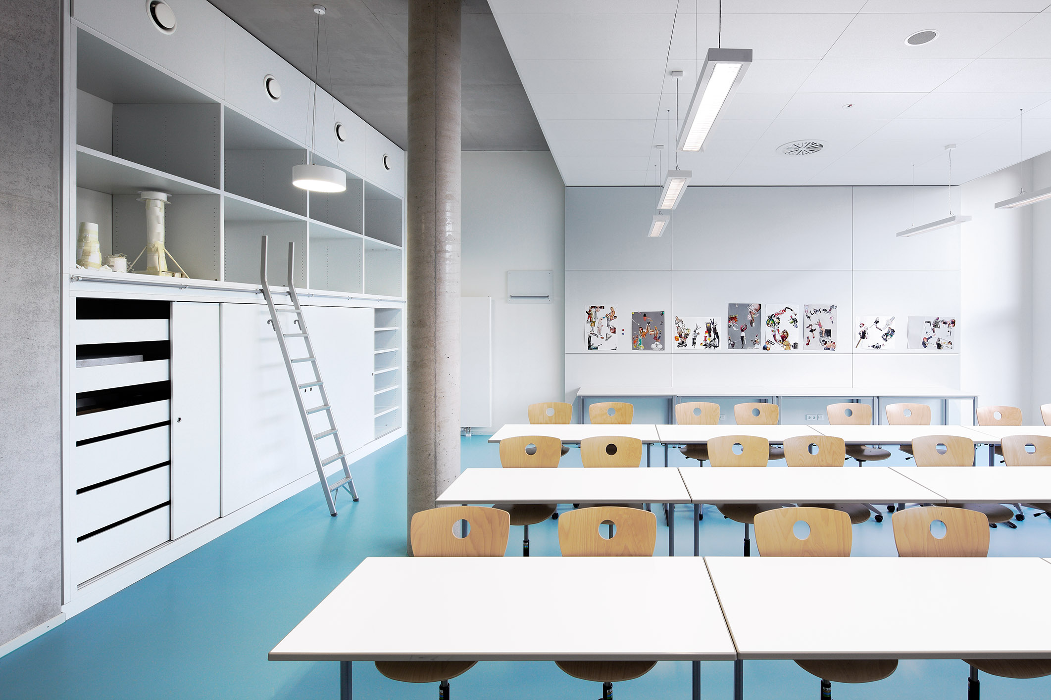 Auf dem ehemaligen Grundstück der FAGRO, in zentraler Lage von Groß-Gerau, sollte gegenüber dem Bahnhof der Neubau der PDS errichtet werden. Das Grundstück, ein Eckgrundstück war nahezu zu 100% überbaut und Teile der Gebäude standen unter Denkmalschutz. Das Gebäude in der August-Bebel-Str. 16 sollte erhalten bleiben, während die historischen Abmessungen sowie die Fassadenstruktur der großen Werkhalle in der Sudetenstraße und des Gebäudes in der August-Bebel-Str. 18 mit dem Neubau aufgenommen werden sollten. Die Schule umfasst ca. 550 Schüler und Schülerinnen der Jahrgänge 10 bis 12. Im Raumprogramm sollten neben den allgemeinen Unterrichtsräumen und Fachräumen, Möglichkeiten geschaffen werden, die schulischen Arbeiten nach außen zu präsentieren. Als Gebäudestruktur wurde ein Mäander gewählt. So konnten die Fassaden zu den jeweiligen Straßen, August-Bebel-Str. und Sudetenstraße, in Höhe und Abmessung variieren, um auf die Vorgaben der Denkmalpflege zu reagieren. Städtebaulich entstanden so ein halböffentlicher Platz mit schaufensterartigen Verglasungen vor den Kunsträumen und ein introvertierterer Bereich als Atrium für musikalische Veranstaltungen und Schulhof. Das Herz der Schule ist die mehrgeschossige Pausenhalle mit Treppenanlage als zentraler Anlaufpunkt und Verteiler im Gebäude. Hier werden besondere Lernlandschaften in Form von unterschiedlichen Sitznischen und Lernzonen für informelle Kurzgespräche angeboten, die neben den konventionellen Klassenzimmern als erweiterte Lernorte und Aufenthaltsbereiche den Schüler und Lehrern zur Verfügung stehen. Von hier werden alle wesentlichen Bereiche der Schule erschlossen. Im Erdgeschoss befinden sich die öffentlichen Bereiche mit Eingangsbereich / Pausenhalle, variabler Aula, Kiosk und die Fachräume Kunst und Musik. Im 1.Obergeschoss befindet sich die Verwaltung mit dem zentralen Lehrerzimmer, die Mediothek räumlich Geschlossen, aber mit interessanten Sichtbezügen zur Pausenhalle. Sonst befinden sich hier weitere Fachräume für Informatik und die sprachlichen Räume, in denen 2 Klassenräume über mobile Trennwände zu einem großen Raum zusammengeschlossen werden können. Im 2.OG sind die naturwissenschaftlichen Räume mit Hörsaal und die Fachräume Mathematik untergebracht. Im 3.OG befinden sich neben den allgemeinen Unterrichtsräumen auch Vorbereitungsräume für Lehrer und die Lehrmittelausgabe. Das Gebäude wurde in Passivbauweise erstellt. Als Ergänzung zu den solaren Gewinnen ist im Staffelgeschoss ein Gasblockheizkraftwerk untergebracht und die Lüftungszentrale. Als sommerlichen Wärmeschutz befinden sich in der Fassade Nachtauskühlungsfenster (geschlitzte Fassadenplatten), die neben dem Tragwerk Pfeiler und Trennwandanschlüsse (geschlossene Fassadenplatten) das abwechslungsreiche Bild der Fassaden bilden. Von dem denkmalgeschützten Gebäude in der August-Bebel-Str.16 wurden 2 Fassaden historisch wiederhergestellt. Hinter den historischen Fassaden wurde das Gebäude komplett als Neubau errichtet, um die gestellten bautechnischen Anforderungen erfüllen zu können. Die rückseitigen Fassaden wurden dabei modern interpretiert und schlagen in gestalterischer Hinsicht die Brücke zum Schulneubau.